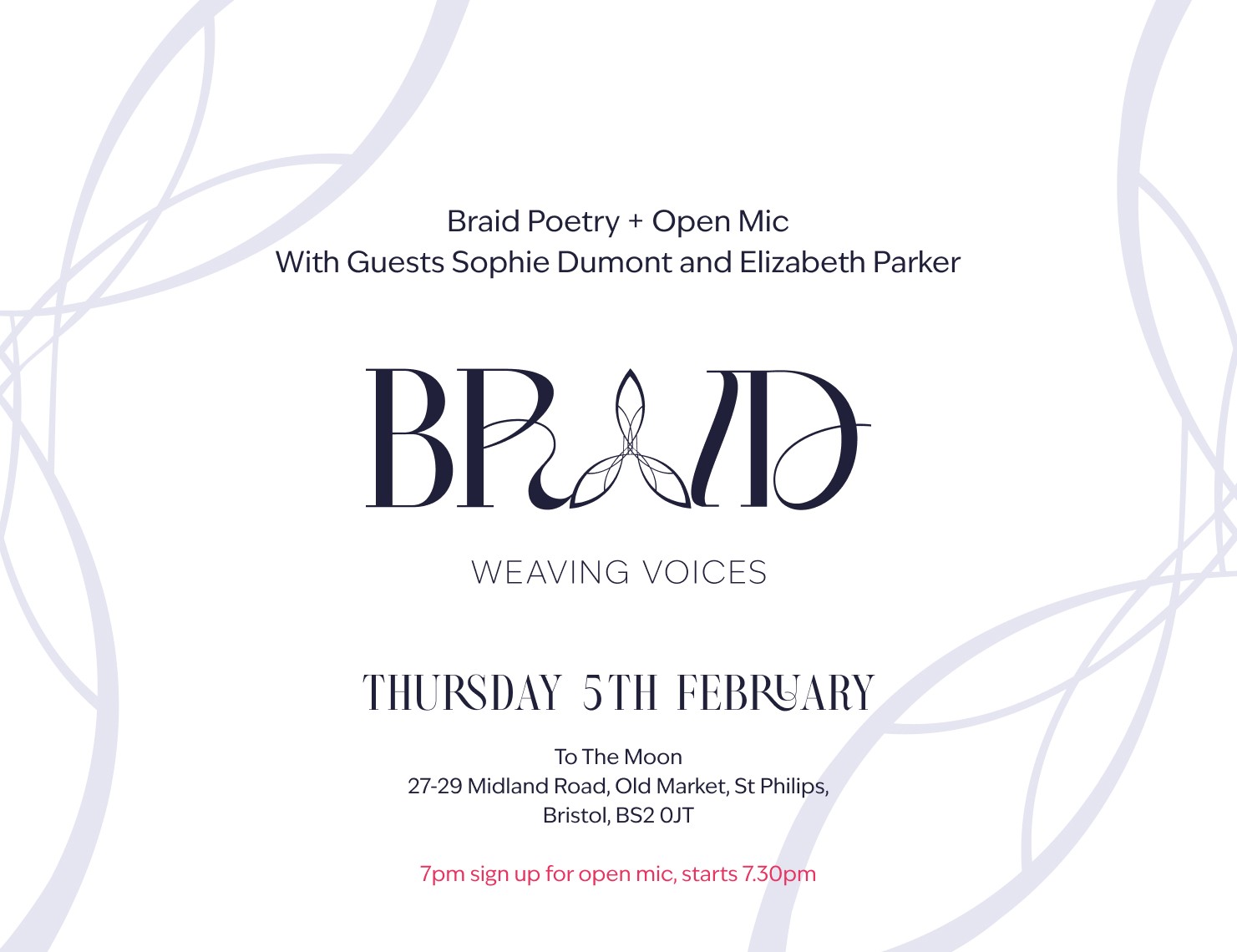 Braid is a Bristol-based poetry performance group led by Kaycee Hill, Naomi Madlock, and Kate Noakes. We are united by a shared passion for words and storytelling, bringing together perspectives from different generations.